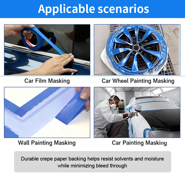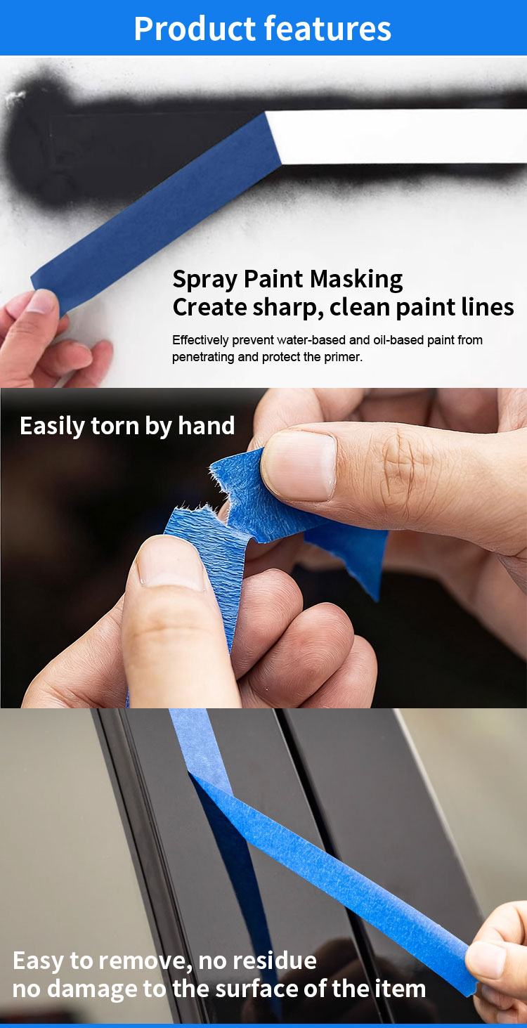Masking tape is using crepe paper as backing material and coated with natural rubber adhesive. It is suitable for indoor decoration spray paint covering, light duty packaging, fasten picture, car repair painting, etc.